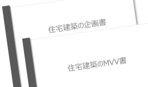 「MVV書」を作成する。 「MVV書」を作成して「Myブランド住宅」を実現します。ポイントは、「MVV(ミッション・ビジョン・バリュー)」を理解して作成することです。 「企画書」は「住まいづくりの方針書」です。「生活・住宅・建築」を、10年・30年・50年という長い年月で考え、近視眼的でなく大局的に整理します。 |